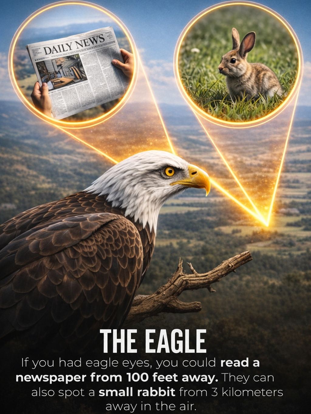 Eagles possess vision so sharp they can spot prey from over 3 kilometers away. Their eyesight is estimated to be 4–8 times stronger than that of humans, allowing them to zoom in on tiny movements from incredible distances.