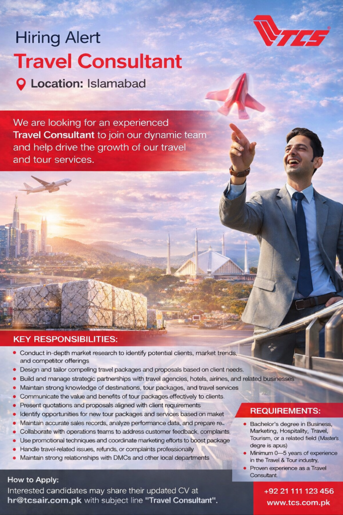 JobsTCS is Hiring A Travel Consultant February 9, 2026February 9, 202601 mins Location Islamabad Post navigation Previous: TCS is Hiring Cargo Accounts ManagerNext: Did Albert Einstein Fake the Math? A Controversial Claim Examined Leave a Reply Cancel replyYour email address will not be published. Required fields are marked *Comment * Name * Email * Website Save my name, email, and website in this browser for the next time I comment.
